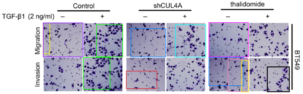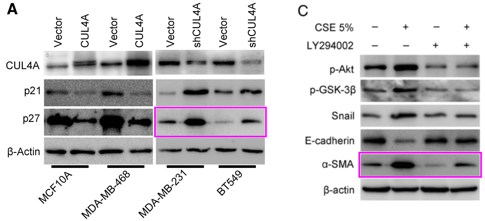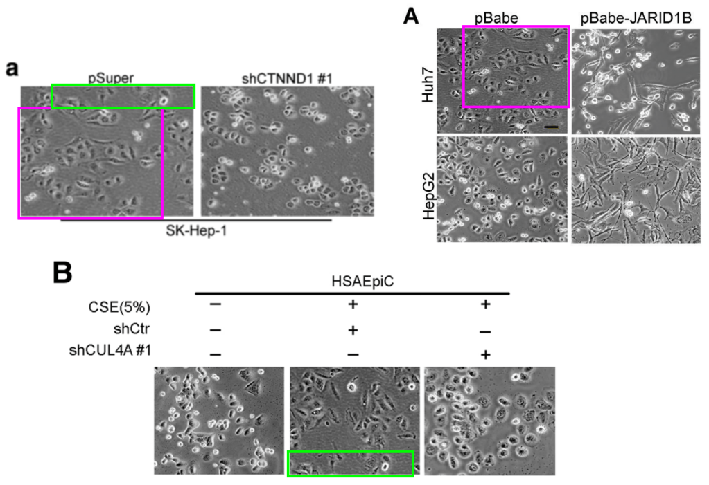 Fig 3C from Hang et al.; Fig 6 from “Suppression of CUL4A attenuates TGF-β1-induced epithelial-to-mesenchymal transition in breast cancer cells” (Wang et al 2017) [retracted]; Fig 3e from “HOXA7 plays a critical role in metastasis of liver cancer associated with activation of Snail” (Tang et al 2016) [retracted].