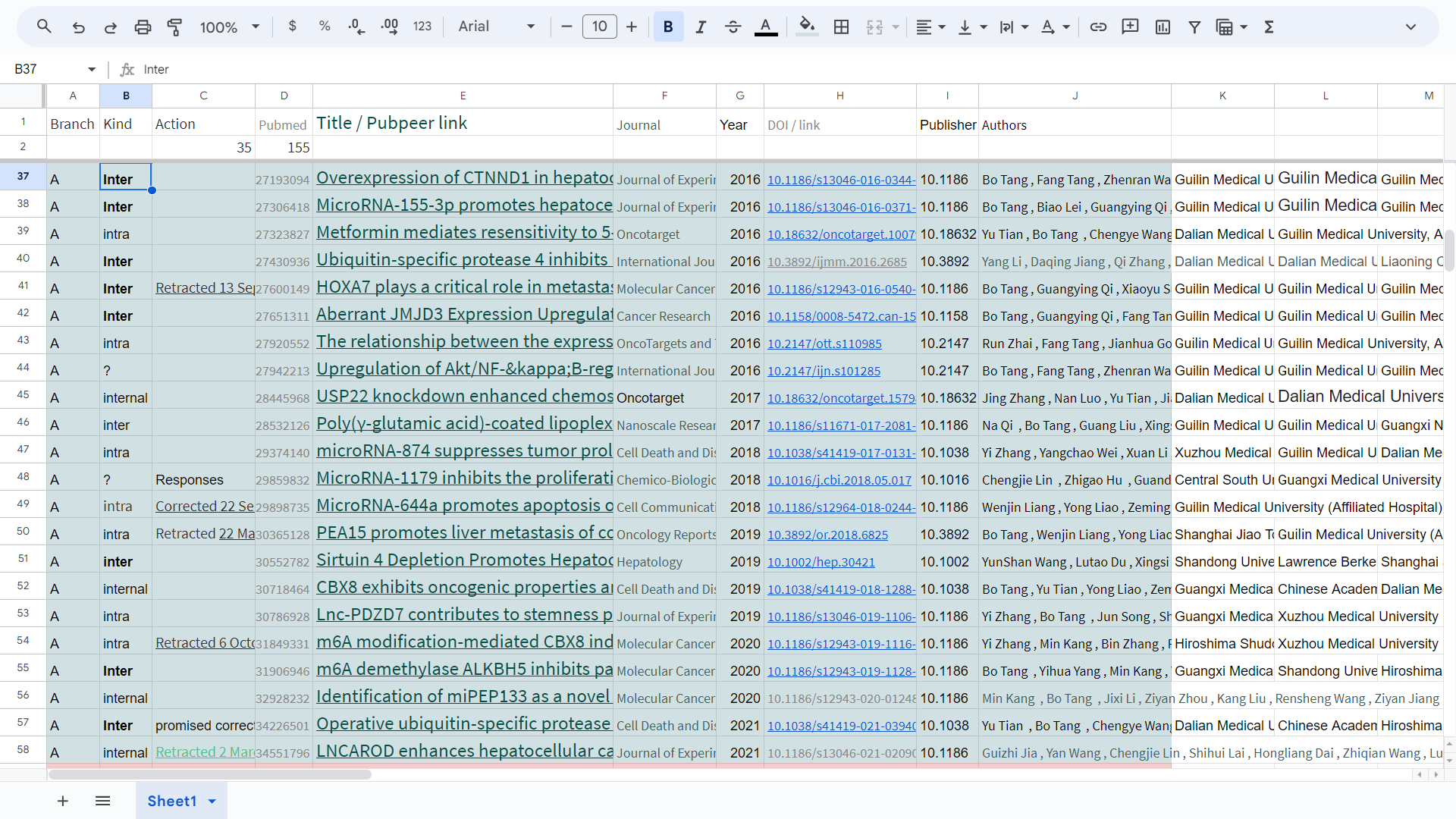 The spreadsheet also marks ‘intersectional’ entries that share material with other branches, to distinguish them from “intra” and “internal” entries where the duplications are confined to that specific branch, or to that paper.**