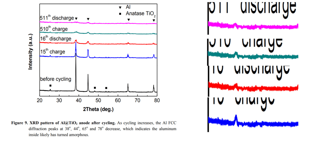 This is very much not expected, as the curves purport to show a pristine aluminum yolk-shell nanoparticle anode (black) and its state after up to 511 charge/discharge cycles. And hence not only the peaks, but also the noise should differ between the measurements.