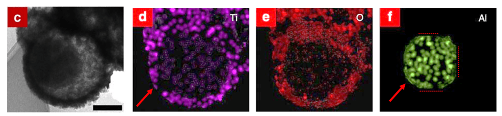 Thallarcha had a good look at the figure and noticed that the TEM image in panel (c) was a magnified version of that in panel (b), see the red rectangles above. This creates two issues. For one, even after correction panel (c) presents a C@MnO2 core-shell particle as an Al@TiO2 yolk-shell particle. And most importantly: the authors seem to have been able to detect Al and Ti in a C@MnO2 particle… Panels (d-f) show EDX maps corresponding to the TEM image in panel (c). And the purple dots in panel (d) show that the Ti atoms indeed sit in their expected ‘shell’ and panel (f) that the Al atoms form a nice ‘yolk’ core. And this is obviously very much impossible for a MnO2 particle.