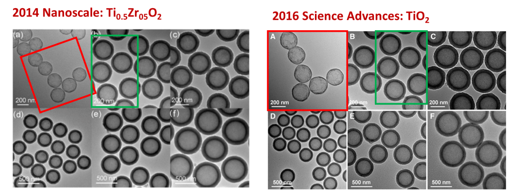 The 2014 Nanoscale paper shows Ti0.5Zr0.5O2 nano-shell particles. The 2016 paper by J. Li claims to show TiO2.