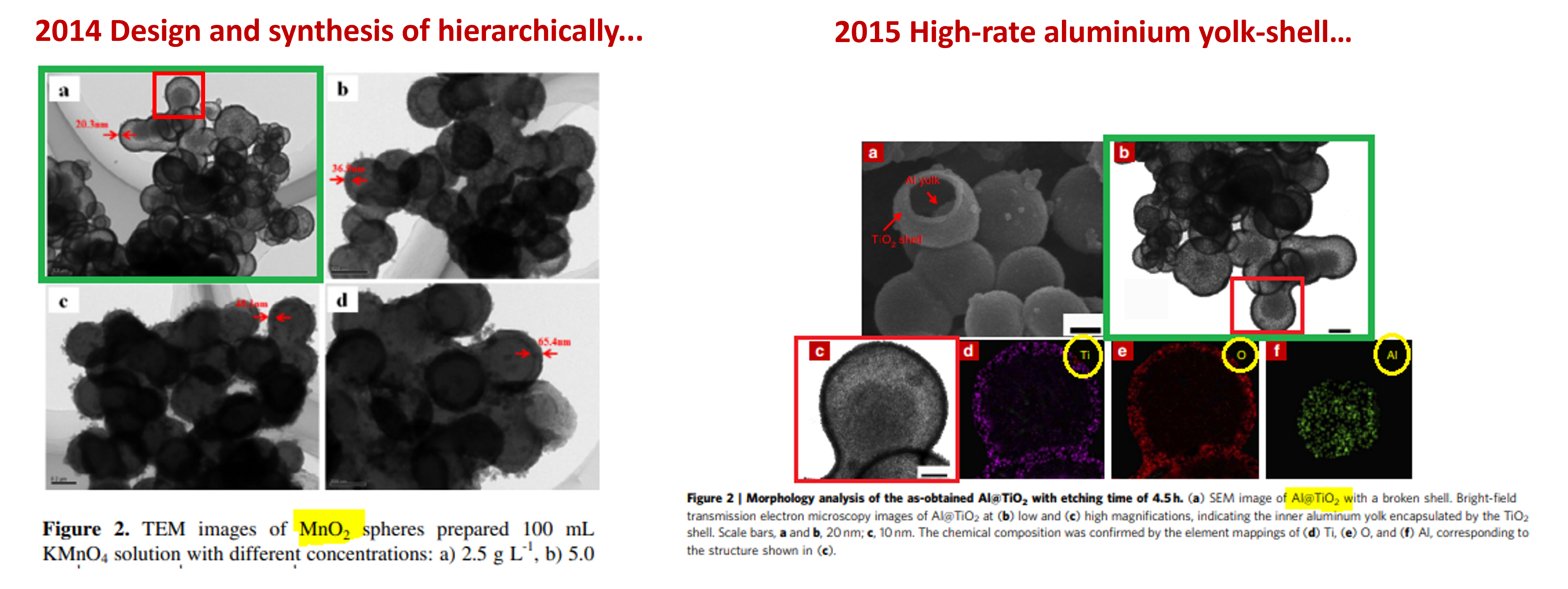 In Figure 2 the authors show SEM and TEM imagery of their Al-TiO2 yolk-shell particles. Except that some two years after publication the authors suddenly realized that there was a mix-up: the image in Fig. 2(b) was not showing a TEM image of Al-TiO2 yolk-shell particles, but instead of MnO2 core-shell particles. It was previously published in a 2014 paper by co-authors Sa Li and Chang-An Wang: