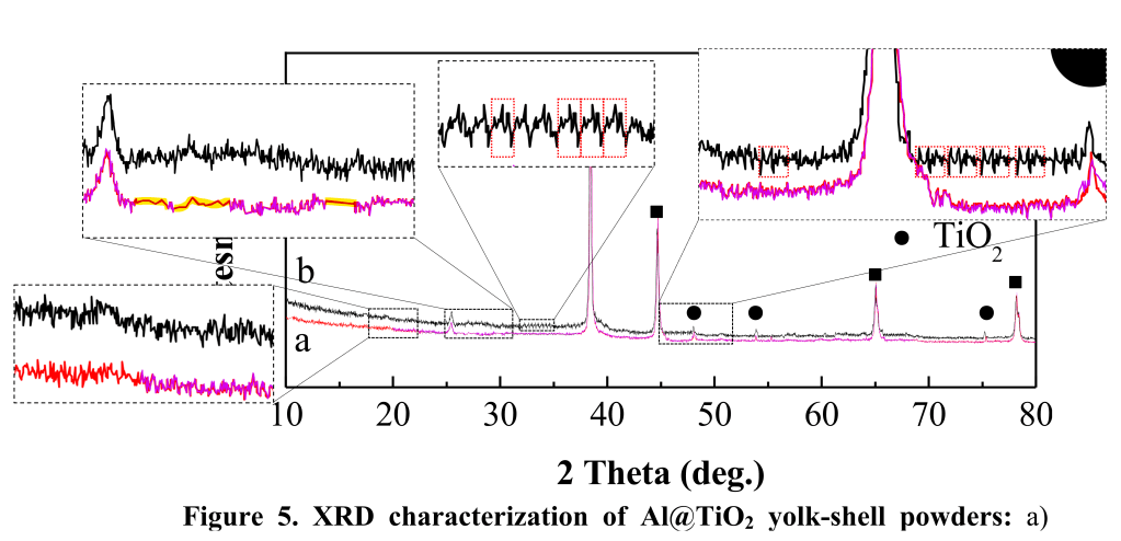 The issues with the XRD data do not stop here. In Figure 5 of the supplementary data the authors want to show that their TiO2 shells protect the Al ‘yolk’ from oxidation. When processing the powder into a battery anode they need to grind it with a binder. Being thorough, the authors check the oxidation resistance of both the powder as-is, red curve (a), as well as after grinding, black curve (b):
