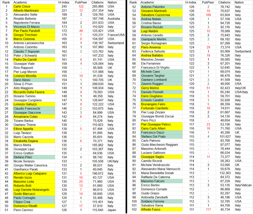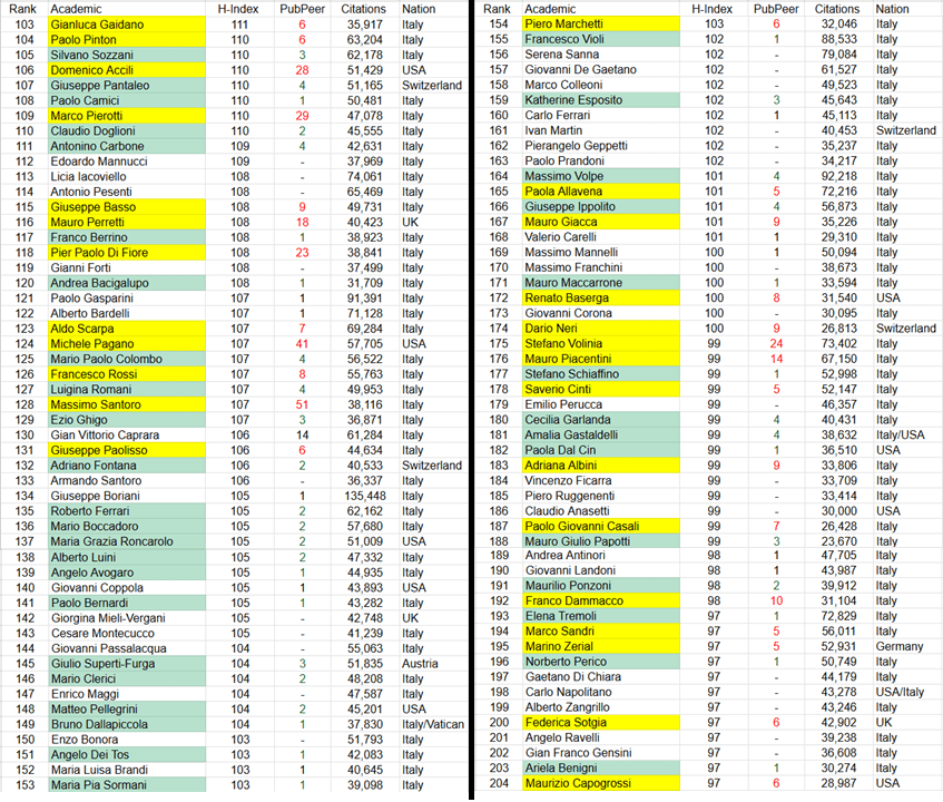 The top 102 positions of the BSL are reported below. In yellow are those people with five or more problematic articles tagged on PubPeer, while in green are those ones with up to four tagged papers. Instead, those names without a colour are people either having no articles flagged at all, or with articles flagged for minor things, or even with positive comments by peers, so please leave them alone for now.