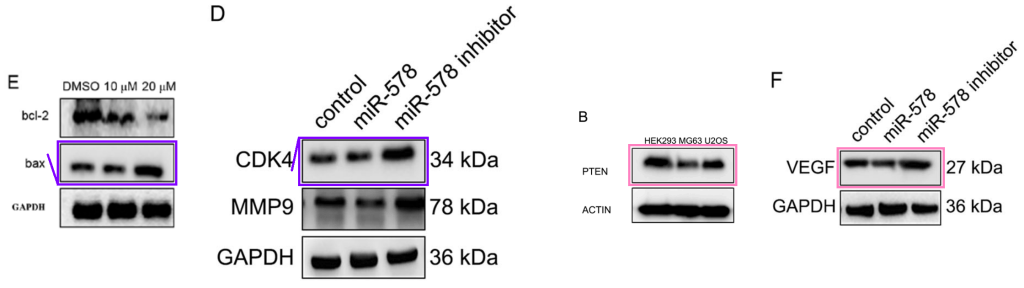 Left to right: Fig 6E  from “miR-141-3p is a key negative regulator of the EGFR pathway in osteosarcoma” (Wang et al 2018) [retracted].