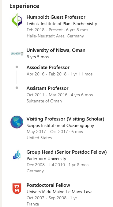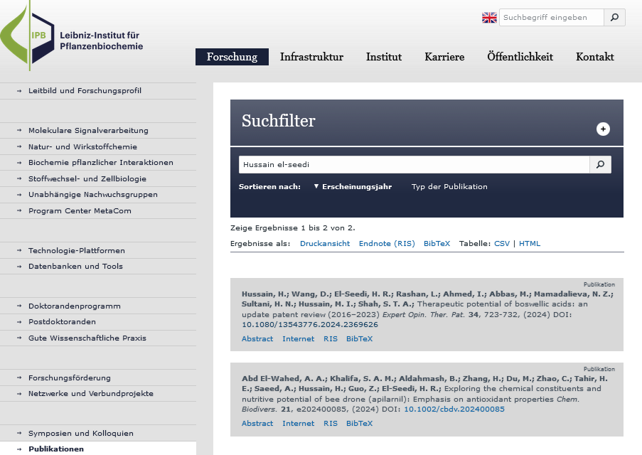 Only that this is only partially true. Hussain indeed used to be employed at IPB since 2018 on a Humboldt-Fellowship as a group leader in the department of Ludger Wessjohann, who is one of IPB directors. But Hussain doesn’t work there anymore. Also his main affiliation as associate professor at the University of Nizwa in Oman ended at 2018. Hussain informs us on his LinkedIn:
