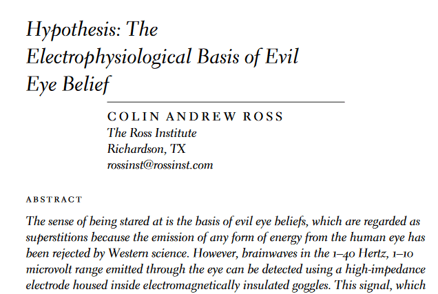 To be scrupulously fair, Ross is not an advocate of reverse-driven retinal emanations. When he proposes that the ‘Evil Eye’ is a real phenomenon, and that individuals with malign intentions can influence events and the health of others at a distance by the power of their gaze alone, neither lasers nor visible light are involved. His eye-beams are the low-frequency gestalts of collective neuronal activity, operating in broadcast mode and channelled to shine out forward by the anatomy of the eye-sockets.