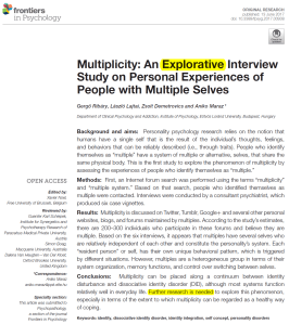 Readers who crave more of this stuff might enjoy “Multiplicity: An Explorative Interview Study on Personal Experiences of People with Multiple Selves” (Ribáry, Lajtai, Demetrovics & Maraz, 2017), a summary of the four authors’ visits to MP forums and support groups. I have not checked whether they have separate entries at the Department of Clinical Psychology & Addiction at Eötvös Loránd University, preferring to believe that they are alters within a single headspace.