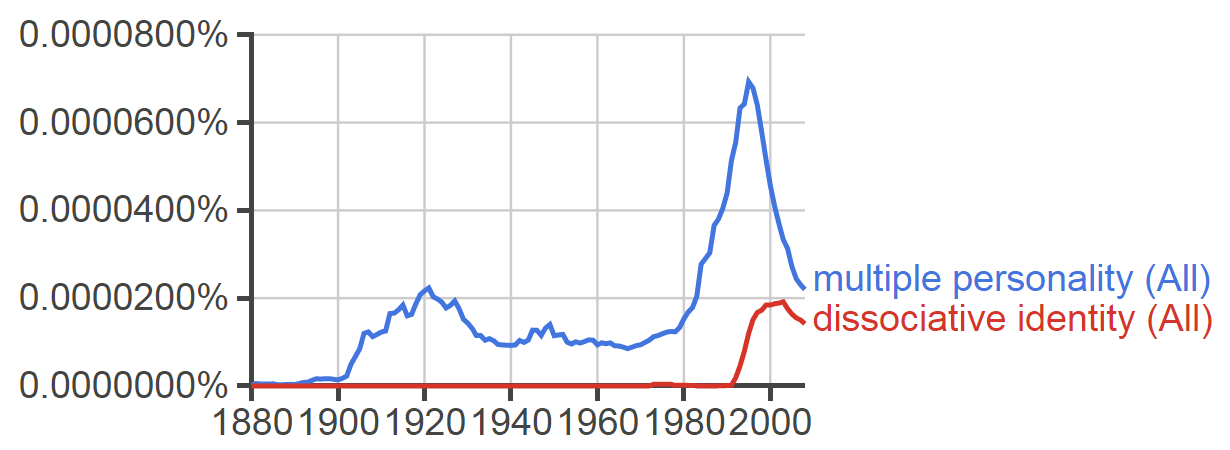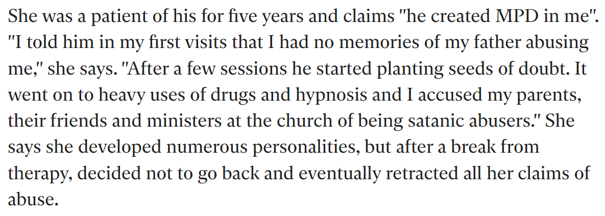 Ross, in contrast, is still with us. He enjoys a following within new-age / conspiracist circles, on account of his opinionations on the prevalence of multiple personality disorder (MPD). As quondam President of the International Society for the Study of Trauma and Dissociation, he is perhaps the greatest populariser of this problematic construct.