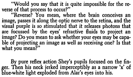 If I recall correctly, eye-lasers first featured in Charles Harness’ masterpiece of ‘wide-screen baroque’, ‘The Paradox Men’ (Superman’s X-ray vision does not count because reasons). The idea is that the retina and the optics are capable of transmitting energy as well as receiving it.