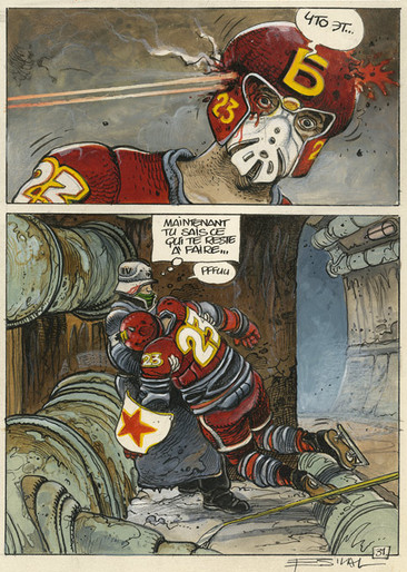 So here is Alcide Nikopol casting his eye-beams upon an unfortunate ice-hockey player whose identity he intends to usurp. I must explain that in this first book of the ‘Nikopol Trilogy’, the character is possessed by an alternative personality in the form of the renegade god Osiris Horus, after the Egyptian pantheon stranded their pyramidal starship over Paris… Horus went renegade because he disagreed with the pantheon’s policy of negotiating with the French theofascist regime about refuelling rather than just taking it by force.