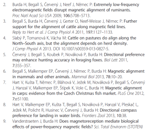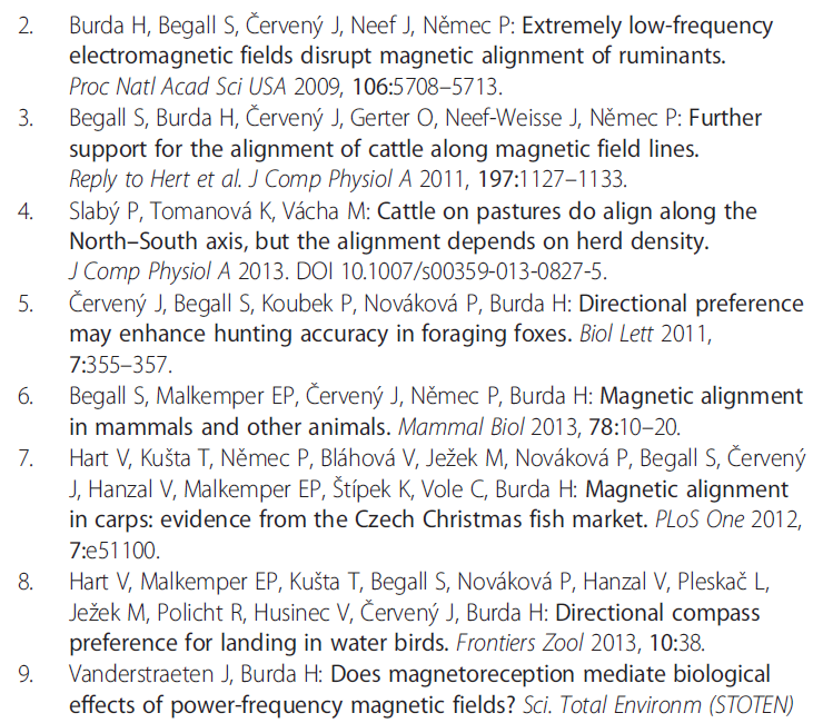 Vlastimil Hart, Petra Nováková, Erich Pascal Malkemper, Sabine Begall, Vladimír Hanzal, Miloš Ježek, Tomáš Kušta, Veronika Němcová, Jana Adámková, Kateřina Benediktová, Jaroslav Červený & Hynek Burda Dogs are sensitive to small variations of the Earth’s magnetic field. Front Zool (2013). doi: 10.1186/1742-9994-10-80