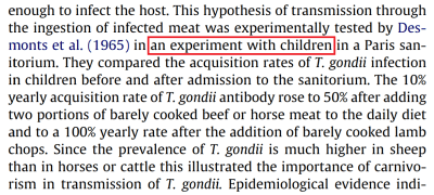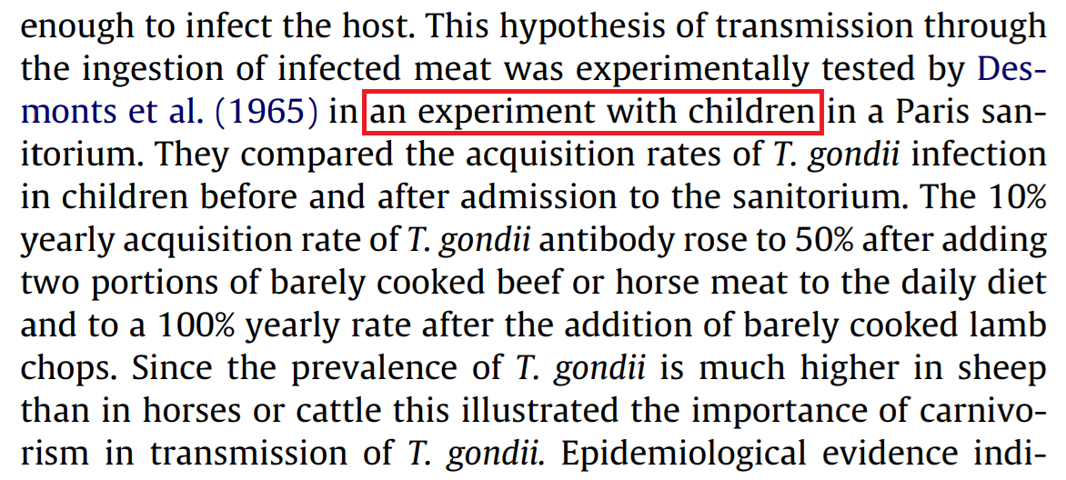 Étude épidémiologique sur la toxoplasmose: de l’influence de la cuisson des viandes de boucherie sur la fréquence de l’infection humaine” sounds like an interesting study. Did Desmonts et al. (1965) deliberately supplement the diet of children in a tuberculosis sanitorium with undercooked meat to see if they would contract toxoplasmosis? This was France, after all, where medical ethics are serious business, ask Didier Raoult. No-one citing the paper seems to have read it (preferring to copy descriptions from earlier literature reviews) and it is possible that exaggerations intruded in the course of retelling. Some Wiki-editor thought the tale could be improved by changing “sanitarium” into “orphanage“.