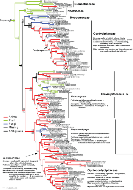 3. The phylogenetic tree of the Cordyceps family is inspired by the map of California. No-one knows why. ↩︎