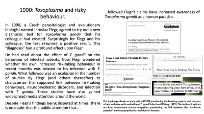 • Jaroslav Flegr, Influence of latent Toxoplasma infection on human personality, physiology and morphology: pros and cons of the Toxoplasma–human model in studying the manipulation hypothesis J Exp Biol (2013) doi: 10.1242/jeb.073635