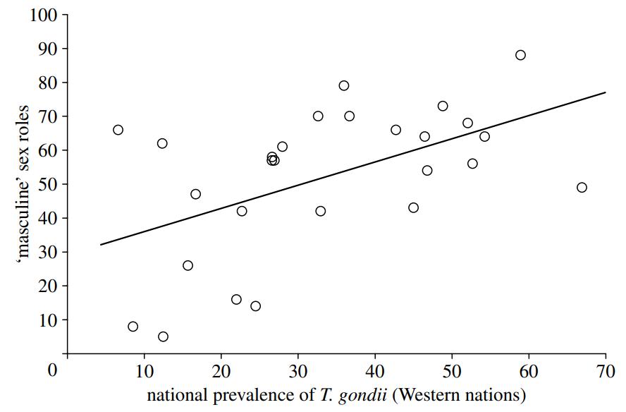The symphony of silly-buggers reached a crescendo with the 2006 announcement by Kevin Lafferty (advised by Flegr) that variations in Toxo prevalence explain inter-country average differences along personality scales (therefore explaining cultural differences)… the correlations are significant as long as you ignore outliers or confine the analysis to only Western countries.