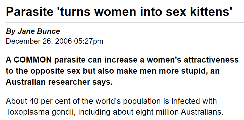 Now the Czech professor Jaroslav Flegr of biology Charles University in Prague is better-known as the doyen of a different line of research in which T. gondii is held to manipulate host behaviour for its own reproductive benefit. As any fule kno, T. gondii requires a cat as its definitive host (in the broad sense of any felid species). But instead of infecting other cats directly, it opted for a typically byzantine parasite life-cycle: the “eggs” (oocytes) try to infect some other animal as an intermediate host in the hope of eventually arriving in the stomach of another cat that eats the intermediate. Possibly after a long chain of intermediate-to-intermediate transmission-by-consumption. Clearly a risk-taking, cat-seeking, more-comestible intermediate host is preferable from the T. gondii perspective, so the protozoa seem to modify the behaviour of rodent hosts to make them un-cowrin and less tim’rous… in laboratories at least, for it is hard to test whether gondified rats and mice in the wild become reckless & tastier & interested in cat smells.