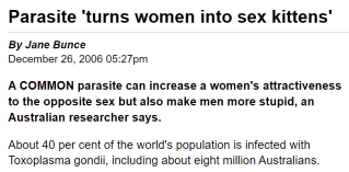 Jaroslav Flegr, Pavlína Lenochová , Zdeněk Hodný , Marta Vondrová Fatal Attraction Phenomenon in Humans – Cat Odour Attractiveness Increased for Toxoplasma-Infected Men While Decreased for Infected Women PLoS Neglected Tropical Diseases (2011) doi: 10.1371/journal.pntd.0001389
