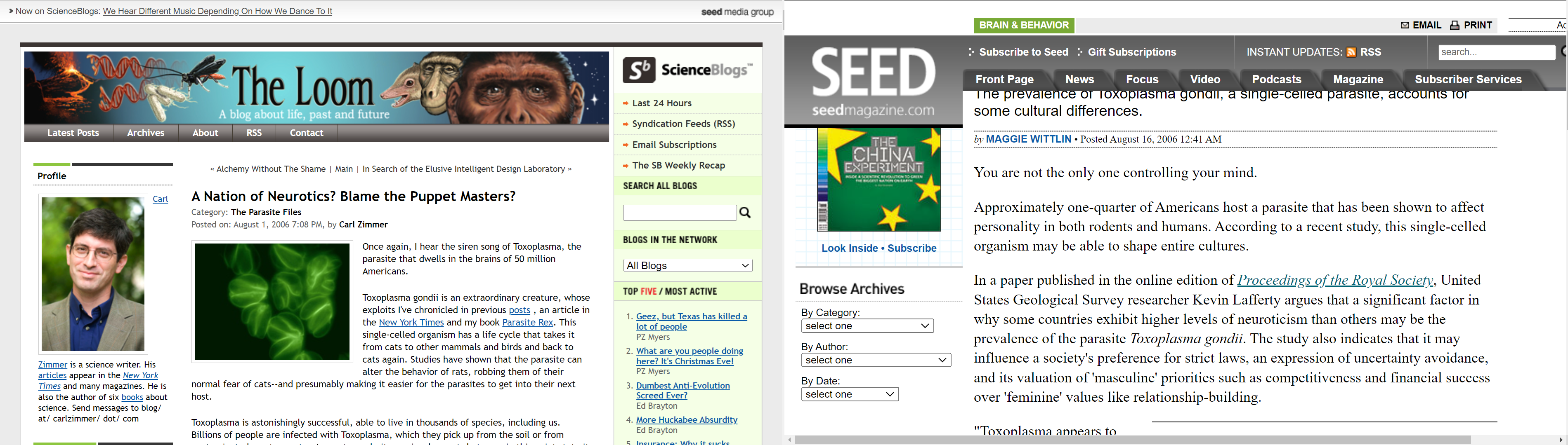 • Jaroslav Flegr, Effects of toxoplasma on human behavior, Schizophr Bull (2007) DOI: 10.1093/schbul/sbl074