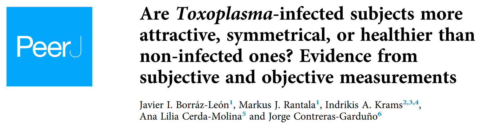 Javier I. Borráz-León, Markus J. Rantala , Indrikis A. Krams , Ana Lilia Cerda-Molina , Jorge Contreras-Garduño Are Toxoplasma-infected subjects more attractive, symmetrical, or healthier than non-infected ones? Evidence from subjective and objective measurements PeerJ (2022) doi: 10.7717/peerj.13122