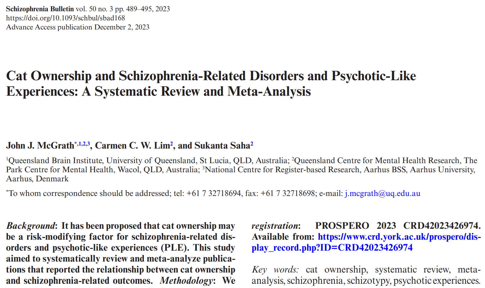 John J McGrath , Carmen C W Lim , Sukanta Saha Cat Ownership and Schizophrenia-Related Disorders and Psychotic-Like Experiences: A Systematic Review and Meta-Analysis Schizophrenia Bulletin (2023) doi: 10.1093/schbul/sbad168