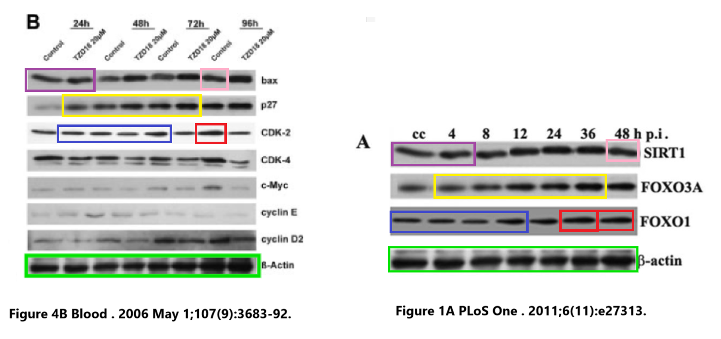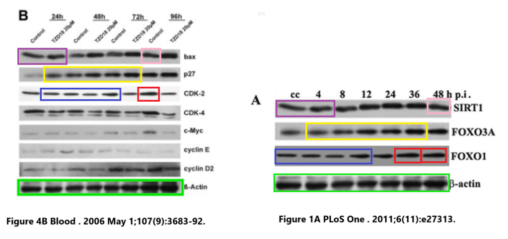 Hanski also attached his rebuttal to PubPeer comments. Regarding the above Bhonde et al 2006, he explained that his „vertically cut blot stripes“ are exactly the right way to do western blots, because “Each experiment was repeated three times“, and that the two p21 panels cannot ever be duplicated because: