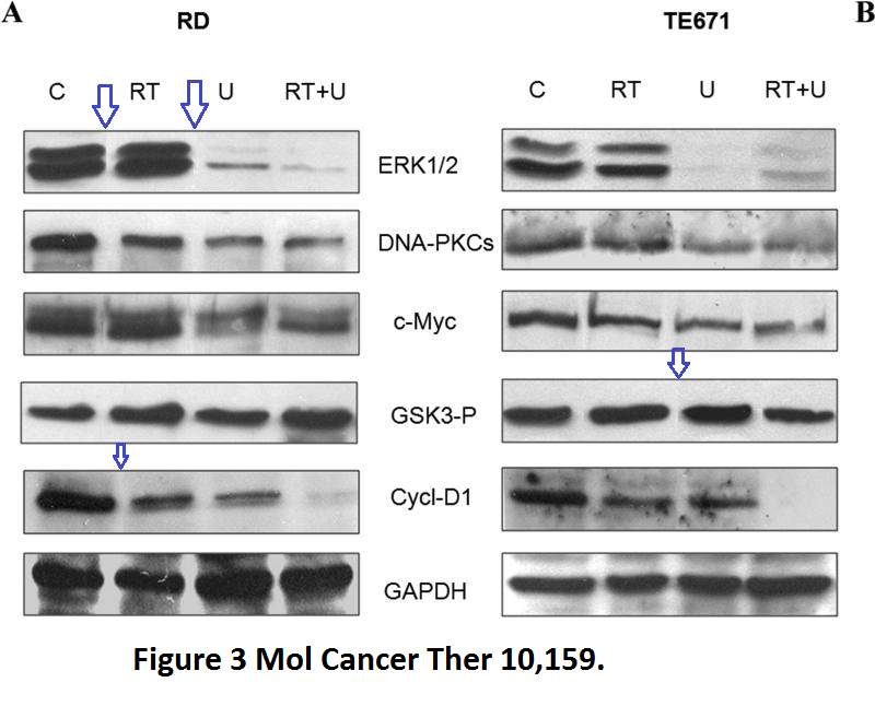 Francesco Marampon, Giovanni Luca Gravina , Agnese Di Rocco , Pierluigi Bonfili , Mario Di Staso , Caterina Fardella , Lorella Polidoro , Carmela Ciccarelli, Claudio Festuccia , Vladimir M. Popov , Richard G. Pestell , Vincenzo Tombolini, Bianca Maria Zani MEK/ERK inhibitor U0126 increases the radiosensitivity of rhabdomyosarcoma cells in vitro and in vivo by downregulating growth and DNA repair signals Molecular Cancer Therapeutics (2011) doi: 10.1158/1535-7163.mct-10-0631