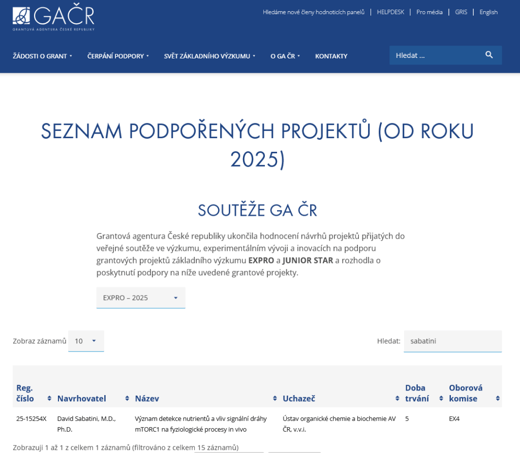 To compensate for this tragic loss in USA, the national funding agency Czech Science Foundation (GA ČR) now gave Sabatini a five year EXPRO grant of CZK 50 million (around €2 million) for his IOCB project “The importance of nutrient detection and the influence of the mTORC1 signaling pathway on physiological processes in vivo” (#25-15254X).