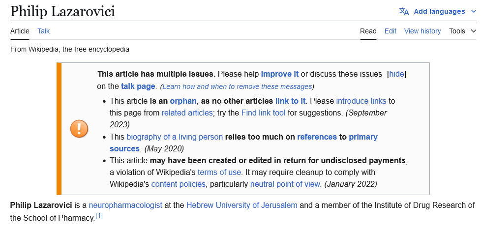 Meet Philip Lazarovici, professor of a neuropharmacology at the Hebrew University of Jerusalem in Israel. The 73 year old is far from retiring: he works on designing polymer nanoparticles “for regenerative medicine” and on curing “neurological disorders using human umbilical cord stem cells“, and will you kindly stop laughing now please? Lazarovici’s Wikipedia page is currently flagged with a note suggesting someone had paid to create it. We won’t point fingers at any Israeli professors.