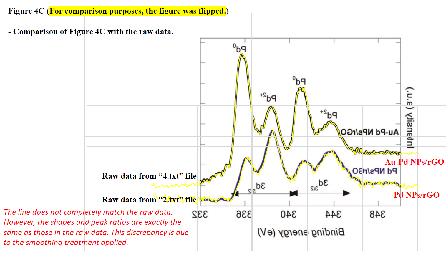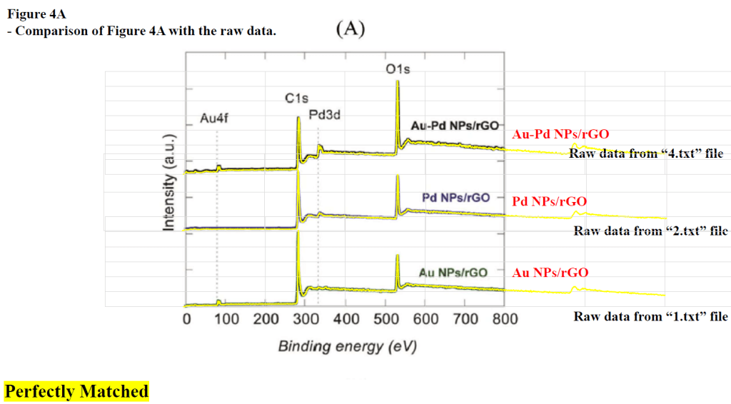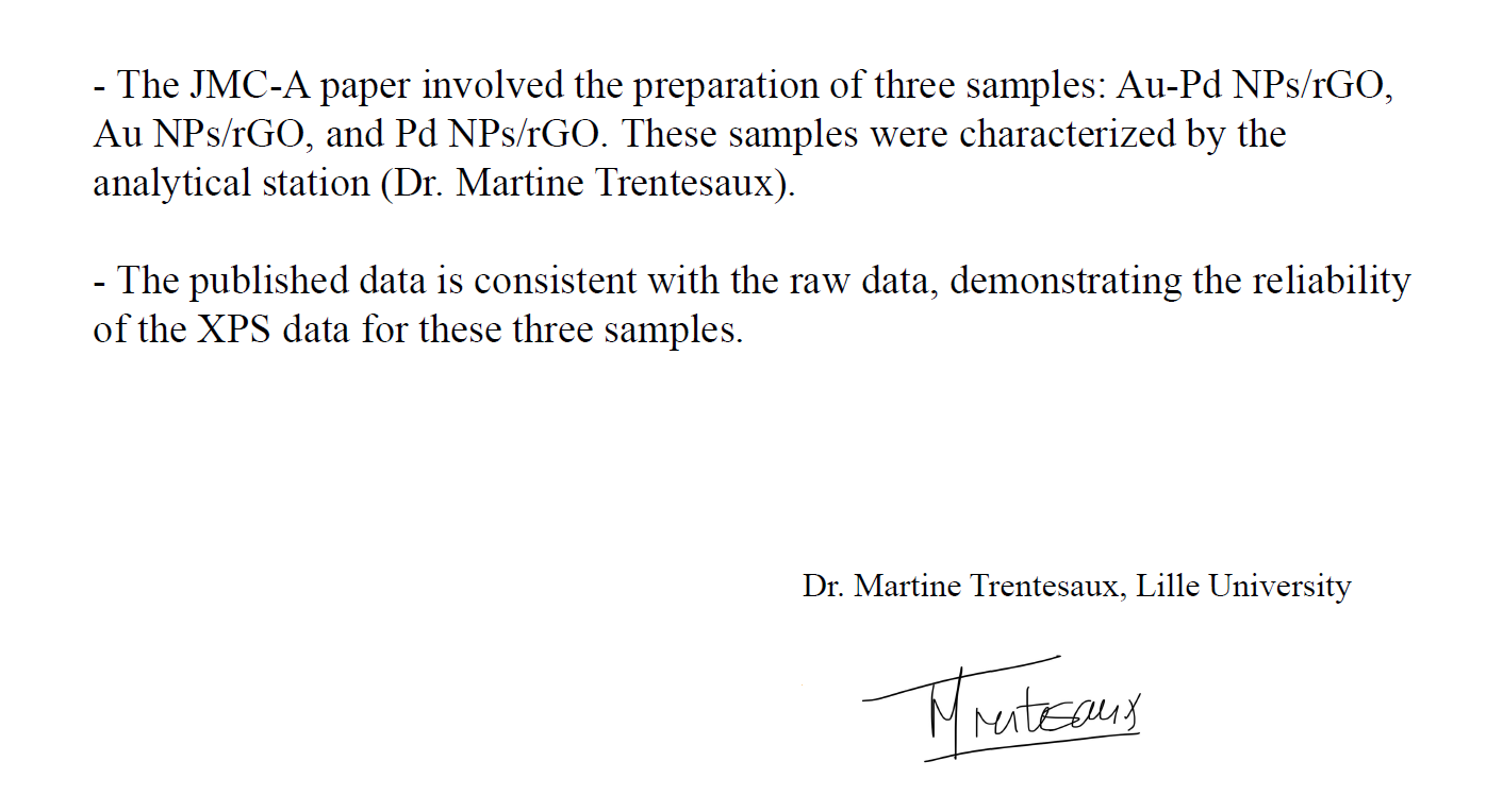 “Representatives from Lille University and other institutions have thoroughly investigated the XPS data. They have concluded that the XPS data published in JMC-A 2015 is accurate for Au NPs/rGO, Pd NPs/rGO, and Au-Pd NPs/rGO, based on the raw data and log sheets from the analytical station. We will report this to the RSC office.