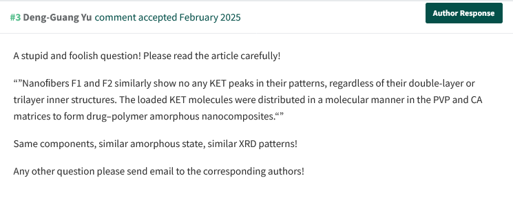“Thank you for reaching out. I absolutely do not agree with Prof Yu. It is correct that the X-ray diffraction patterns for amorphous materials do look similar and share an absence of sharp peaks. However, I would not expect the noise to look the same in the patterns. I have reviewed the comments on Pubpeer and to me they look to be deeply concerning.
