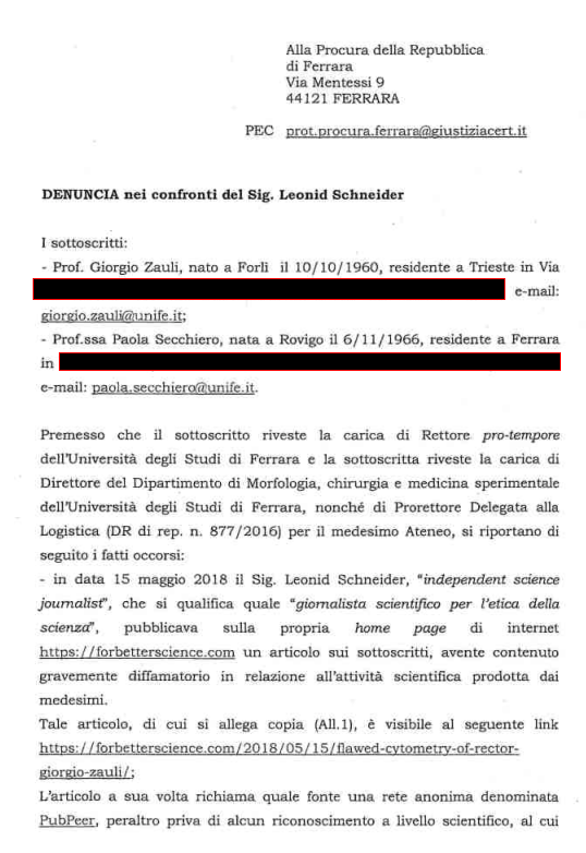 Following my first reporting in May 2018, Zauli (together with his associate Paola Secchiero) reported me to the Italian police (see below), and since then that bully and his university have been suing everyone who dared to criticise them. One Italian journalist was sentenced by Italian justice for my articles on For Better Science (sic!). One Zauli-critical Italian professor is currently being sued by the University of Ferrara for calling it a “sewer”. And it is the Italian public which pays Zauli’s lawyers.