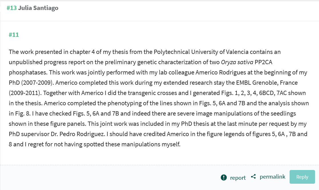 • Dr Santiago openly accused Dr Americo Rodrigues on PubPeer for producing the Chapter 4 data. She said the data were included in her thesis at the last moment, as requested by her mentor Prof Rodríguez. PubPeer’s moderation removed that comment because against the rules. Later the comment was reposted by Dr Santiago without mentioning the name of Americo Rodrigues as the culprit person.