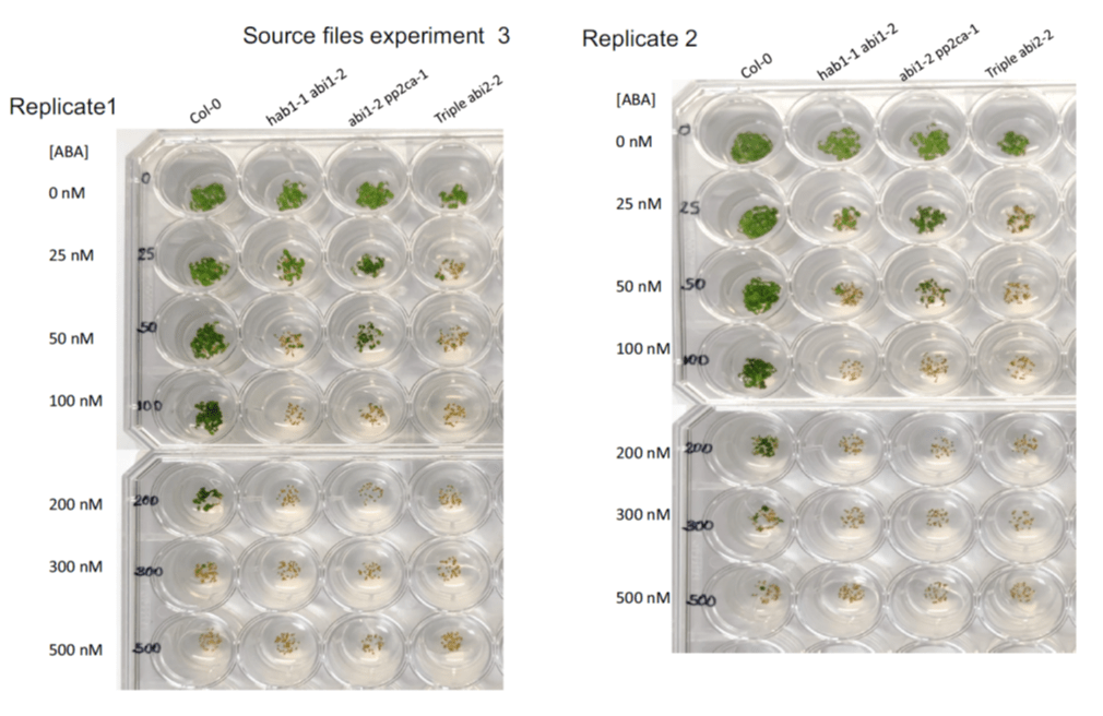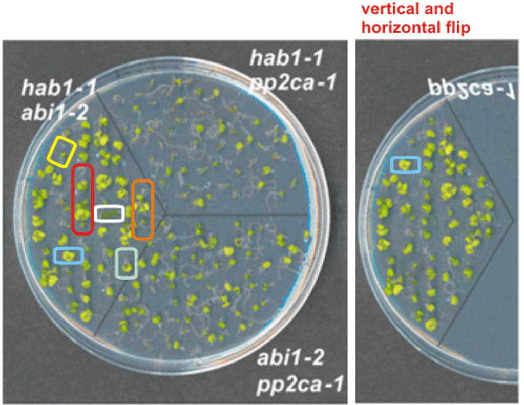 Again it was Elisabeth Bik who found out that in Figure 4C seedlings grown on MS plates containing 200 nM ABA, supposed to represent the double mutant hab1-1 abi1-2 and the mutant pp2ca-1 respectively, were actually sharing a common origin. The little plants are mirrored horizontally, rotated by 180 degrees, and about half of them were digitally modified: