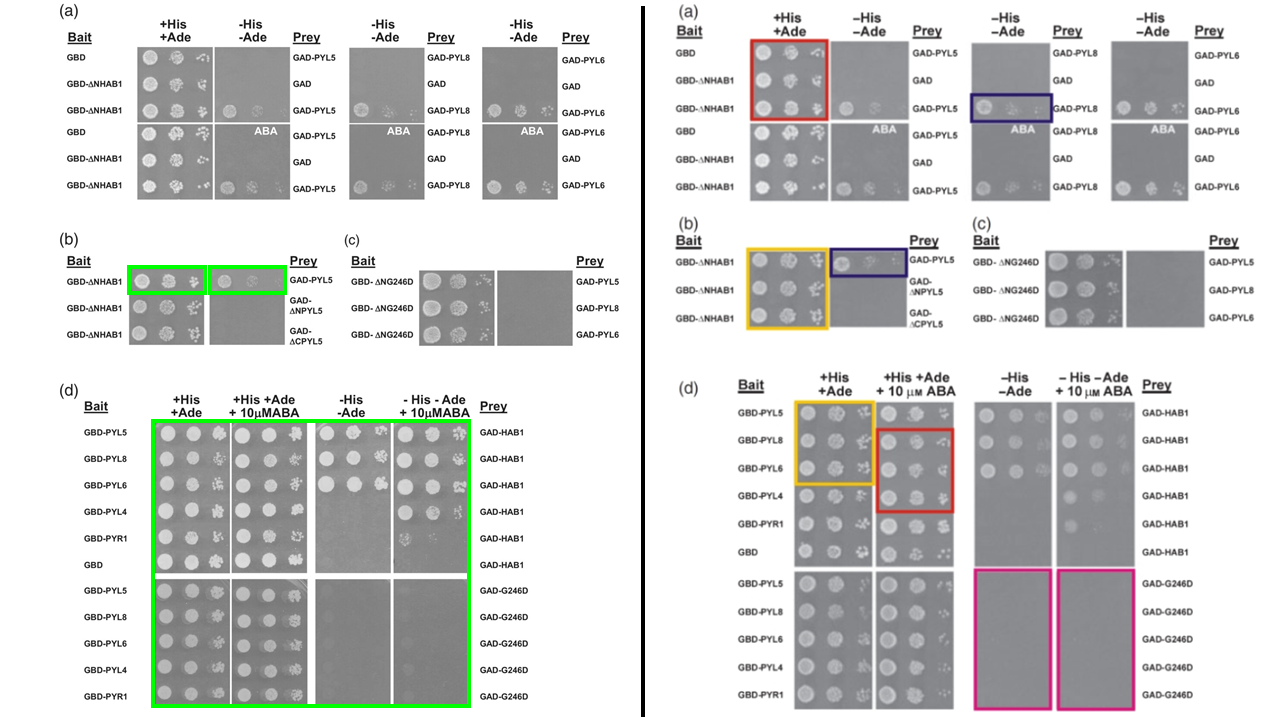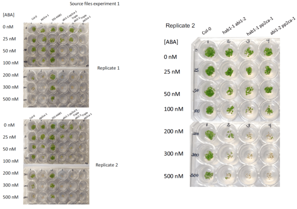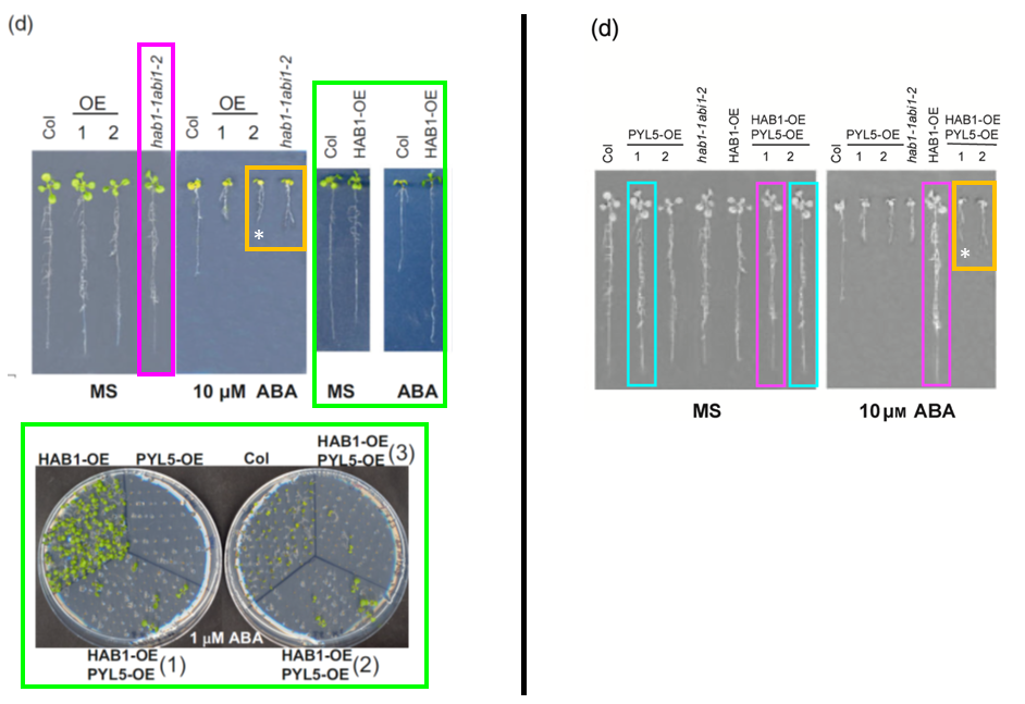 1. One of the duplicated seedlings (magenta boxes), which in the past was describing at the same time the double over-expressor HAB1-OE/PYL5-OE and the over-expressor HAB1-OE, in the new figure describes yet another genotype, the double mutant hab1-1 abi1-2.