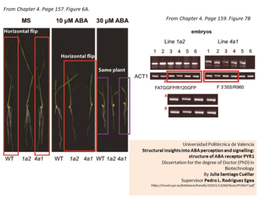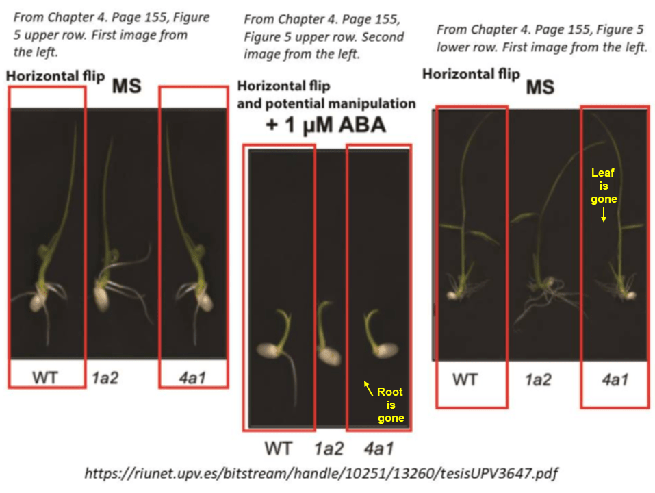 Santiago’s PhD thesis includes lots of questionable data. In addition to the issues of Santiago et al. TPJ 2009 described above, blatant manipulations were found in Chapter 4 of her thesis (credits go to anonymous commenter Parus major for digging this out). Those data remain unpublished, for a good reason. Seedlings describing the wild type plants (WT) and the 4a1 mutants are copy-pasted and mirrored horizontally. Additionally, in one case a root was digitally erased, and in another case a leaf was brushed off. There are also forged RT-PCR gels, because why not: