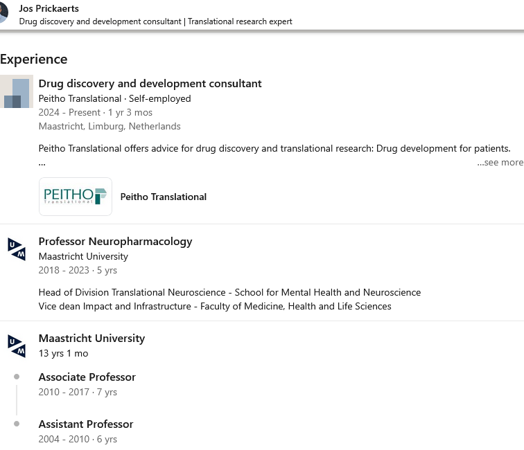 Now look at the LinkedIn profile of the former Maastricht professor of neuropharmacology Jos Prickaerts, who by the end of 2023 suddenly stopped being the MHeNs head of division, and is since 2024 a “self-employed” pharma consultant: