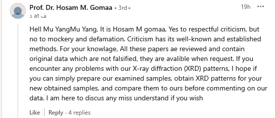 “Hell Mu YangMu Yang, It is Hosam M gomaa, Yes to respectful criticism, but no to mockery and defamation. Criticism has its well-known and established methods. For your knowlage, All these papers ae reviewed and contain original data which are not falsified, they are avalible when request. If you encounter any problems with our X-ray diffraction (XRD) patterns, I hope if you can simply prepare our examined samples, obtain XRD patterns for your new obtained samples, and compare them to ours before commenting on our data. I am here to discus any miss understand if you wish”