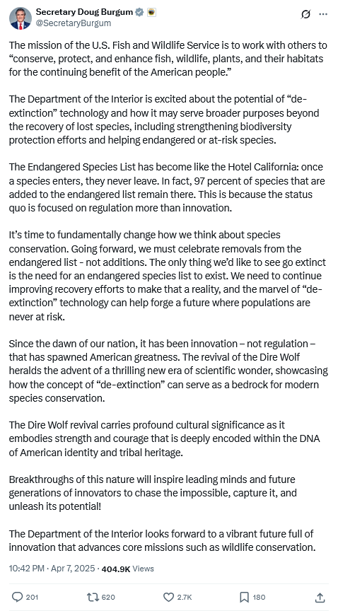 Delisting wolves from endangered status based on this phony claim of the dire wolf de-extinction is so wrong. Matches the overall lying Trump administration approach.