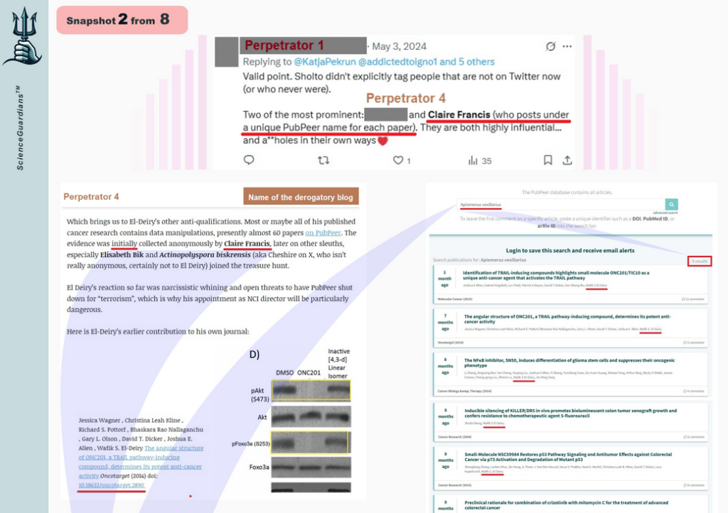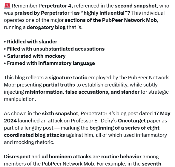 The SciGuardians X-account appears to be doing precisely what El-Deiry claims to despise. It anonymously tries to smear the reputation of PubPeer commenters, by making all kinds of false accusations.