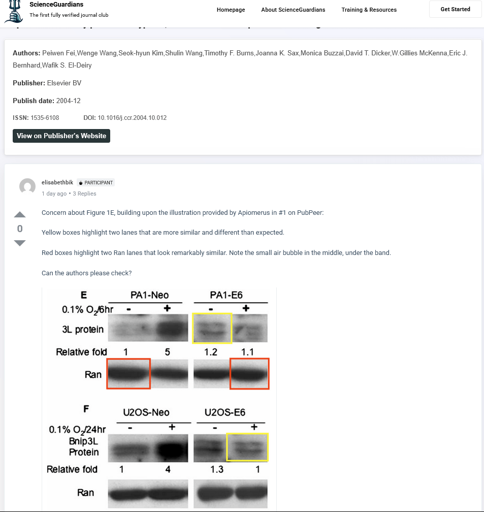 And then Bik did something really funny. She signed up to the Science Guardians website using her old Stanford email account. This is the result, El-Deiry’s papers are now flagged not only on PubPeer but also on Science Guardians.