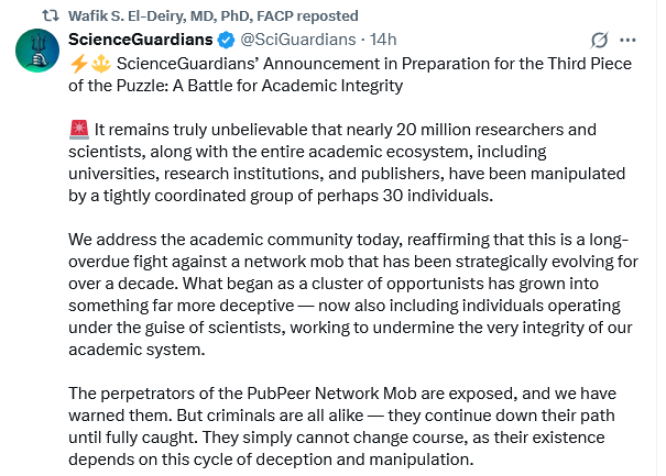 The SciGuardians X-account appears to be doing precisely what El-Deiry claims to despise. It anonymously tries to smear the reputation of PubPeer commenters, by making all kinds of false accusations.