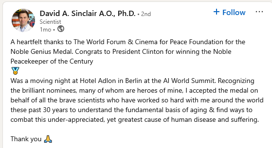 In 2020, Sinclair announced to cure COVID-19 with his anti-aging supplements, and maybe this is what prompted the German musical and film entrepreneur, Jaka Bizilj (who once almost died from COVID-19), to invite Sinclair to The World Forum organised by his Cinema for Peace Foundation, and award Sinclair with the Noble Genius Medal. The event took place in March 2025 in Berlin.