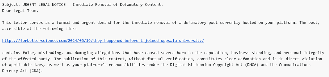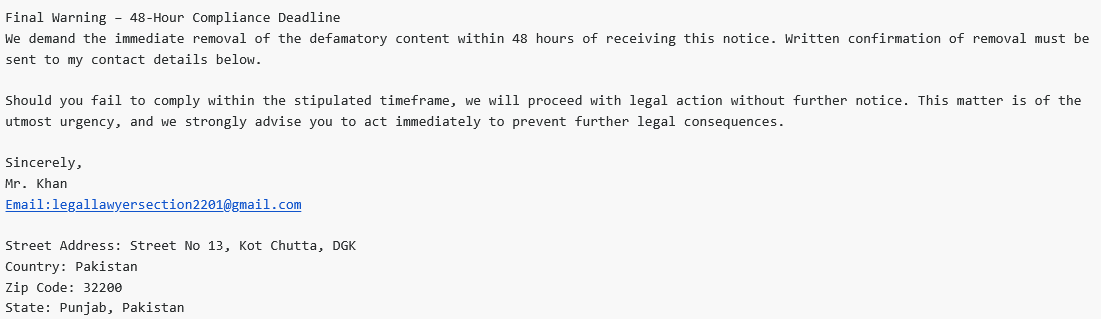 Since then, Lv has been paying random Pakistanis to threaten me with lawsuits and make frivolous DMCA-Take-Down claims. On 3 November 2024, several messages arrived. First, a Muhammad Affan simply wrote: “Please remove the content“. Then, a Muhammad imran specified that he wanted the above article removed: