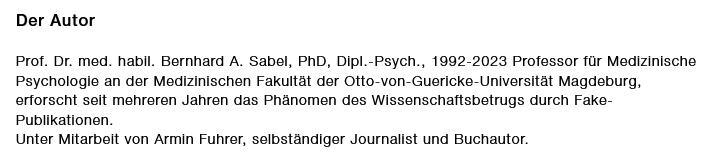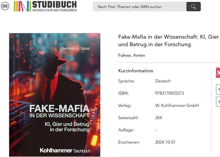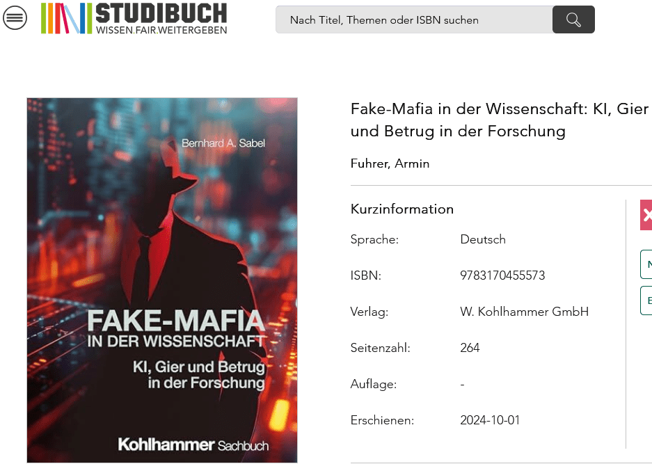 Bernhard Sabel, psychology professor at the University of Magdeburg and Germany’s greatest hero in the fight against papermills (or “criminal science publishing gangs”, as he insisted on calling them, see September 2022 Shorts), inventor of a revolutionary papermill detection tool celebrated by Science and German national newspapers (see May 2023 Shorts), wrote a book about papermill fraud. At least he is the book’s official author. Questions about authorship are met with threats of defamation and damage lawsuits.