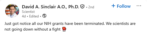 “For David Sinclair, a high-profile genetics professor at Harvard Medical School known for his research on longevity, the grant terminations in his lab hit close to home. His partner’s mother is dying of ALS, a debilitating neurodegenerative disease; and one of two grants cut in his lab was for a star postdoctorate researcher who was making progress reversing ALS symptoms in animals. Using artificial intelligence to speed that research, they thought they might have something in time to save his partner’s mother.