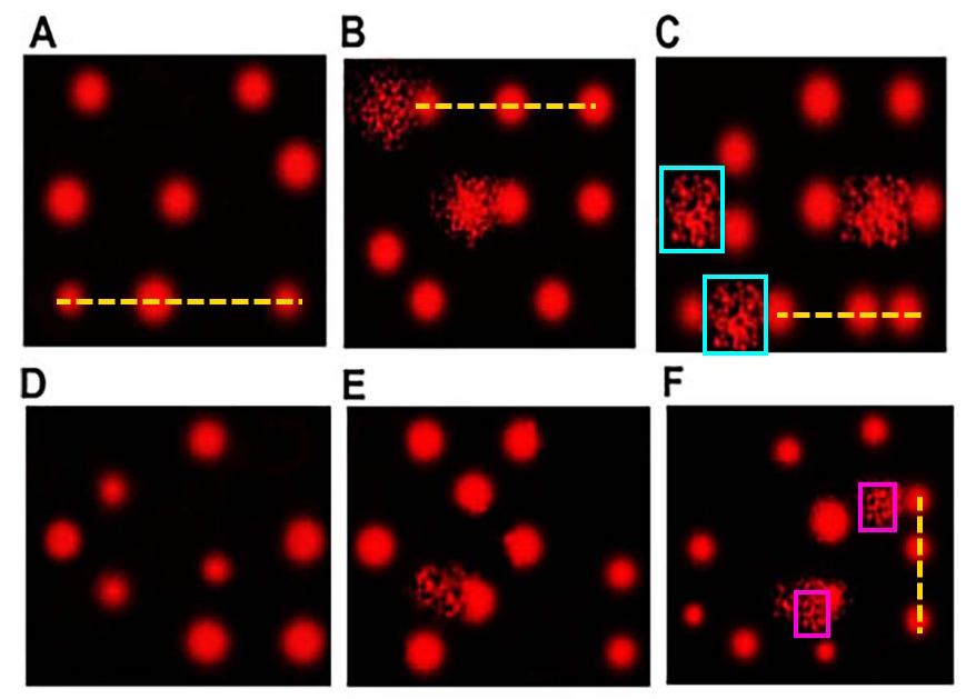 Once again, the specifics of the image are in some ways quite different to the previous two, but the overall appearance has a distinctive style, with a uniform colour hue, duplicate trails, and cells avoiding the edges of the panels. In fabricated comet assays the trails are most often presented on the eastern side of the cells, but they often appear on the southeastern side too.