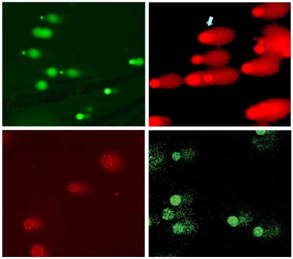 Images of comet assays, clockwise from top left: Hong et al 2020, Zhao et al 2016, Morocz et al 2013, Ye et al 2018