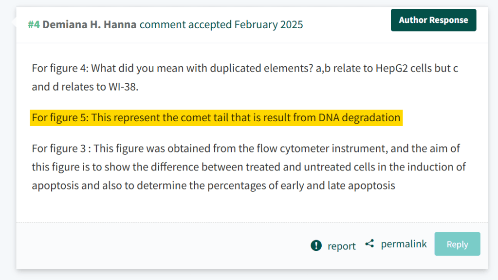 Some author responses to my comments about fabricated comet assays have begun to trickle through on PubPeer. These are predictably poor replies that do not address the substance of the comments. Samar A. Omar responded on the following two papers with blocks of text including extraneous methodological details, and a delightful “proof” provided by Decopy AI.