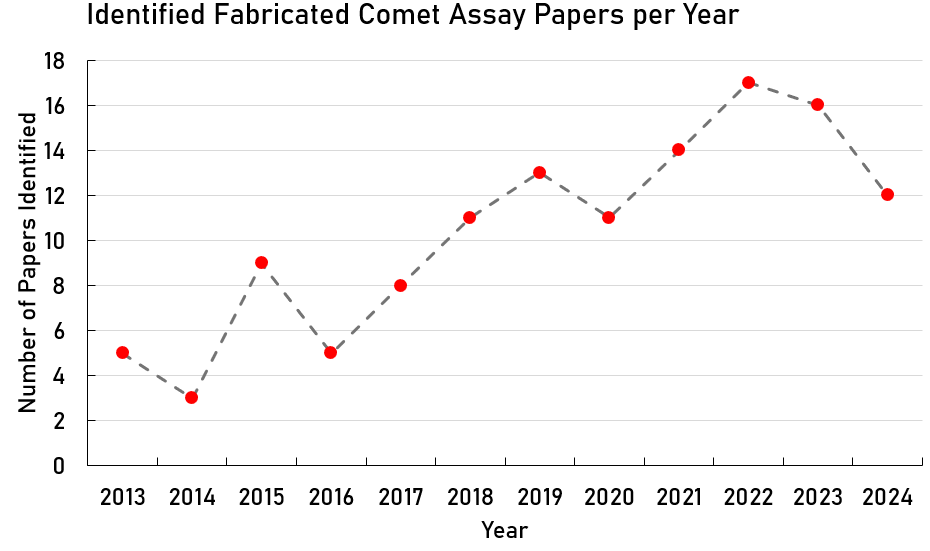 I do not have routine access to subscription journals, so most of my findings are from open access journals and those uploaded to a certain website before 2021. Based on paper titles and authorship patterns I suspect there are a large number of papers behind paywalls with fabricated comet assay images. The problem seems to be an active one, whether it is increasing or not is hard to say. The first examples I have been able to find were published in 2013, with increasing numbers found since. I have not plotted 2025 because of the incomplete data.